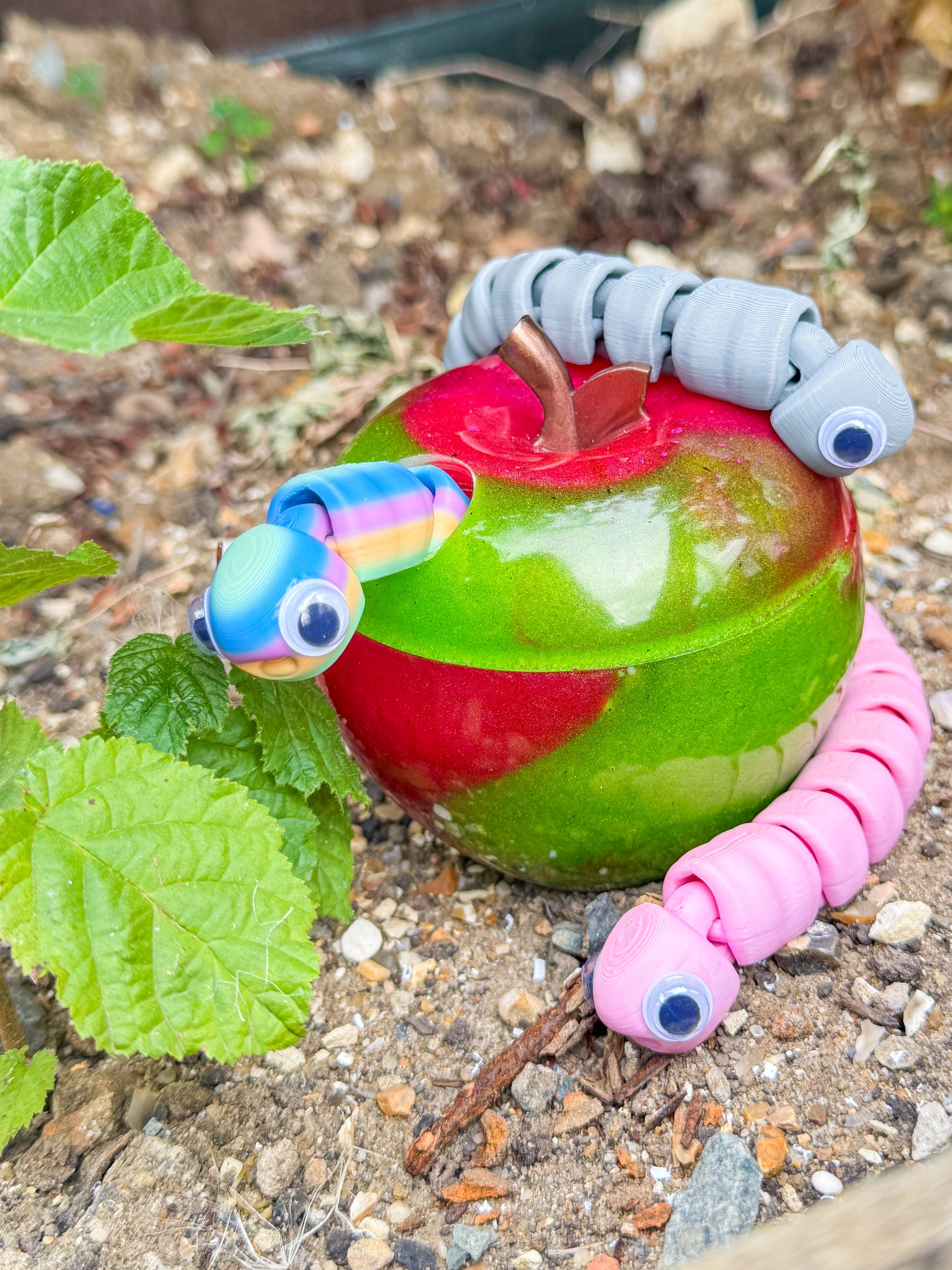 A cheeky little set featuring a shiny resin red and green apple trinket and its wriggly worm pal. Perfect for small world play, storytelling and seasonal trays. Children will love tucking and hiding the worms into the apple and making up their own playful orchard adventures.