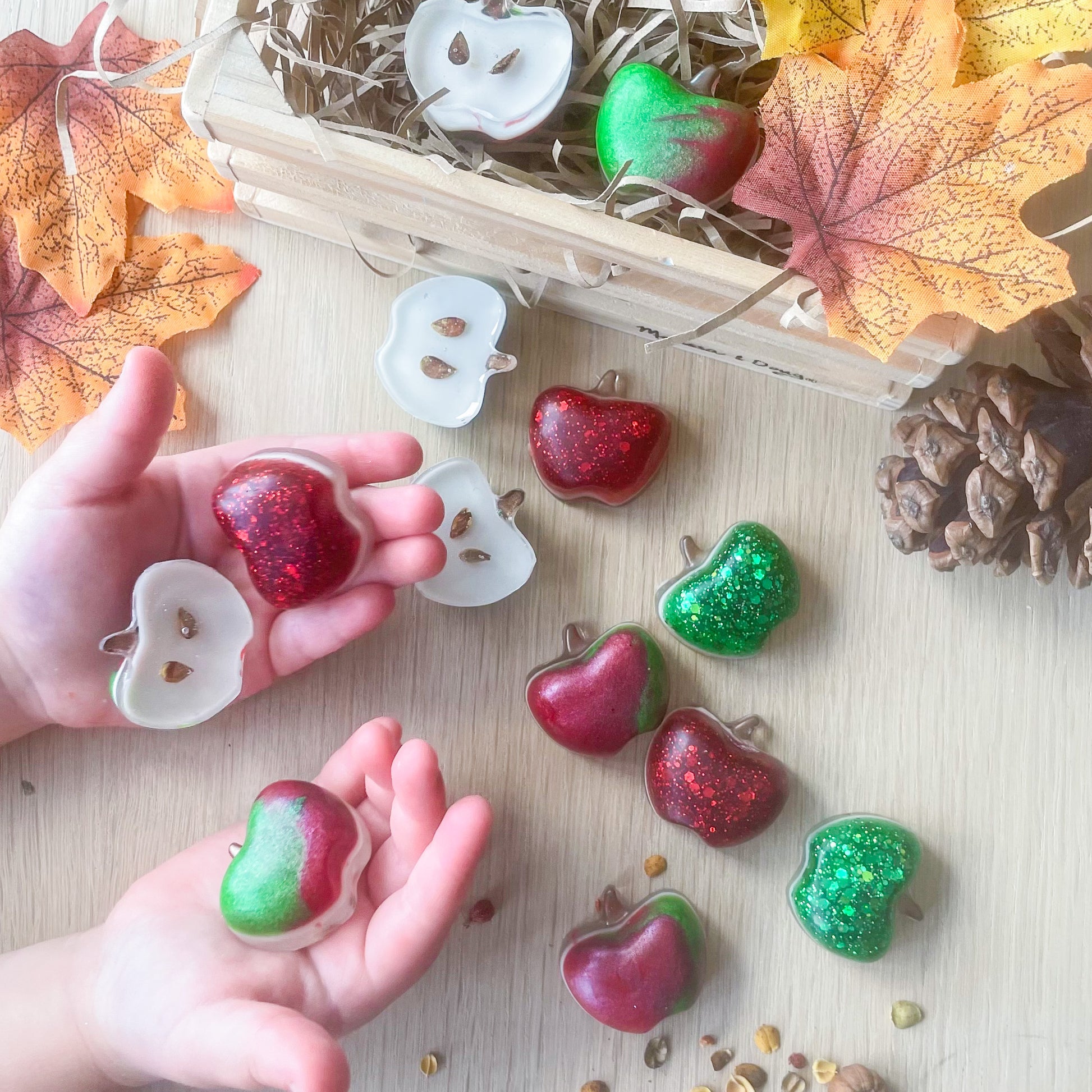 A mix of glittery resin apples and cream swirls, perfect for pie play, autumn baking setups, or as loose parts to inspire seasonal sensory fun.