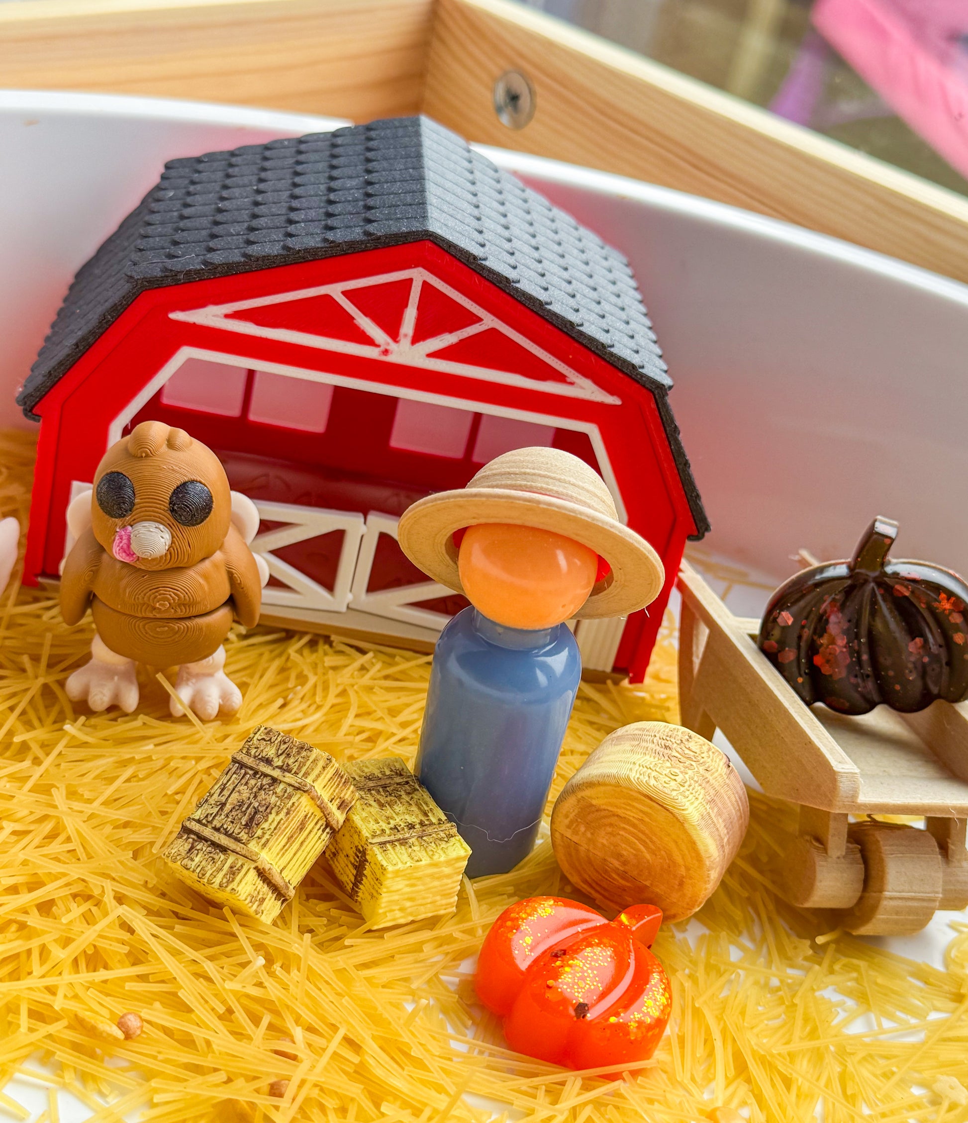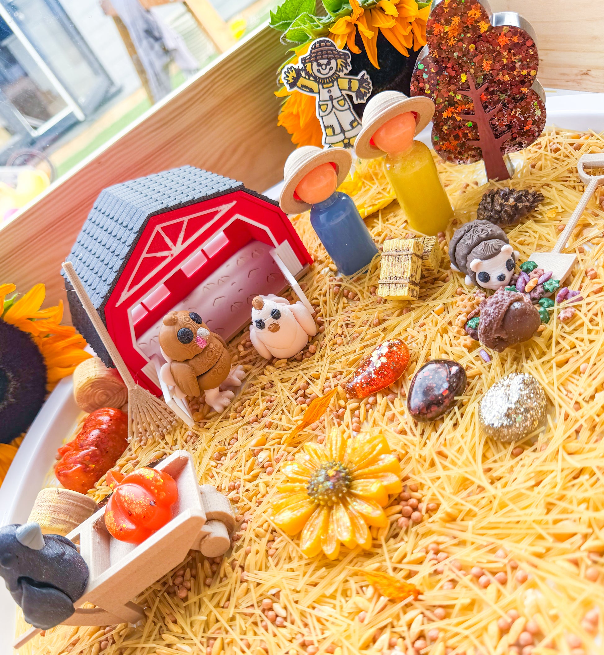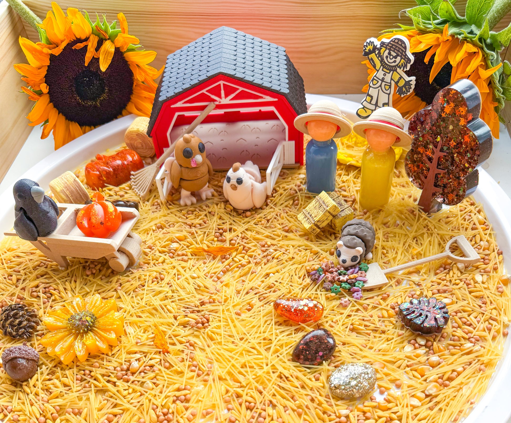 Create your own barnyard scene with this seasonal small world tray. Filled with golden sensory mix, fallen leaves and plenty of farmyard favourites, children can scoop, pour and build their own harvest world, perfect for storytelling, role play and open-ended fun.