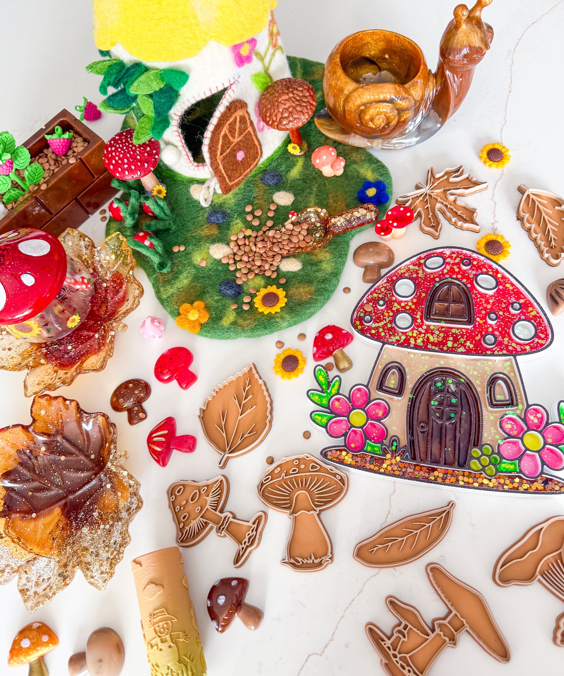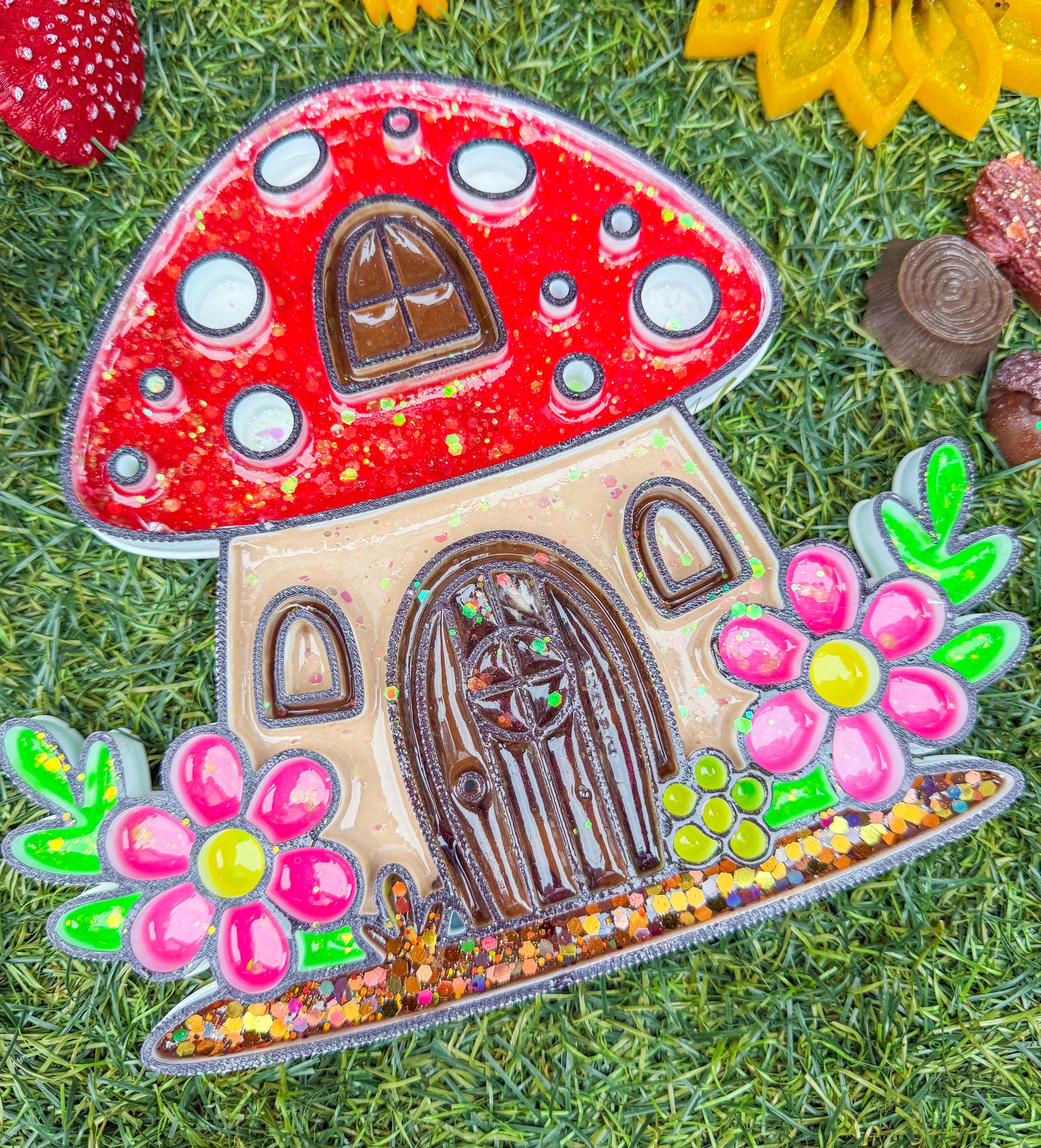 A little cottage shaped like a toadstool, finished with glittery resin details and bright flowers. Children can use it for small world play, sorting, or filling with sensory mixes.