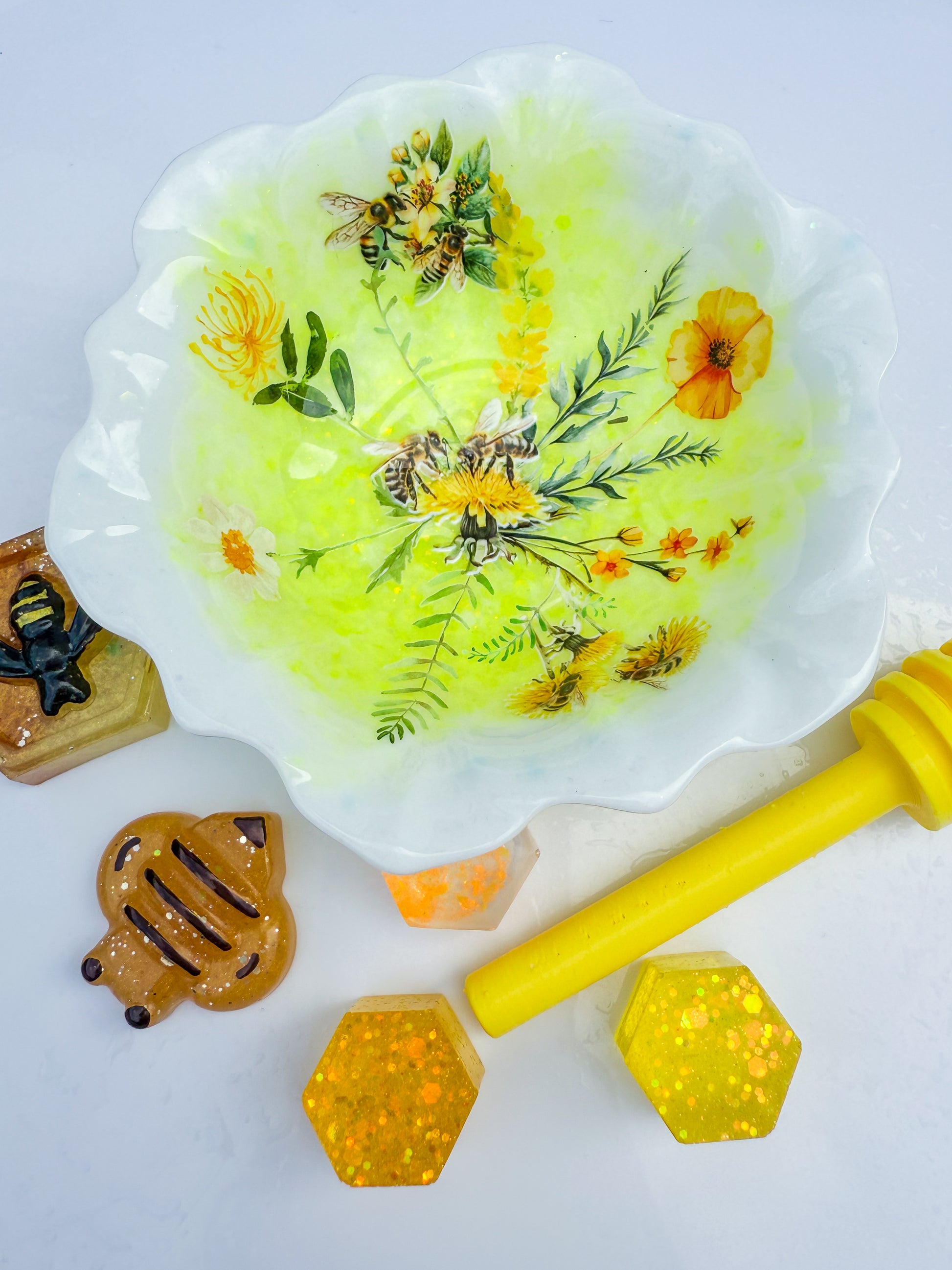 Includes a bee bowl, honey dipper, honeycomb pieces and bee loose parts.