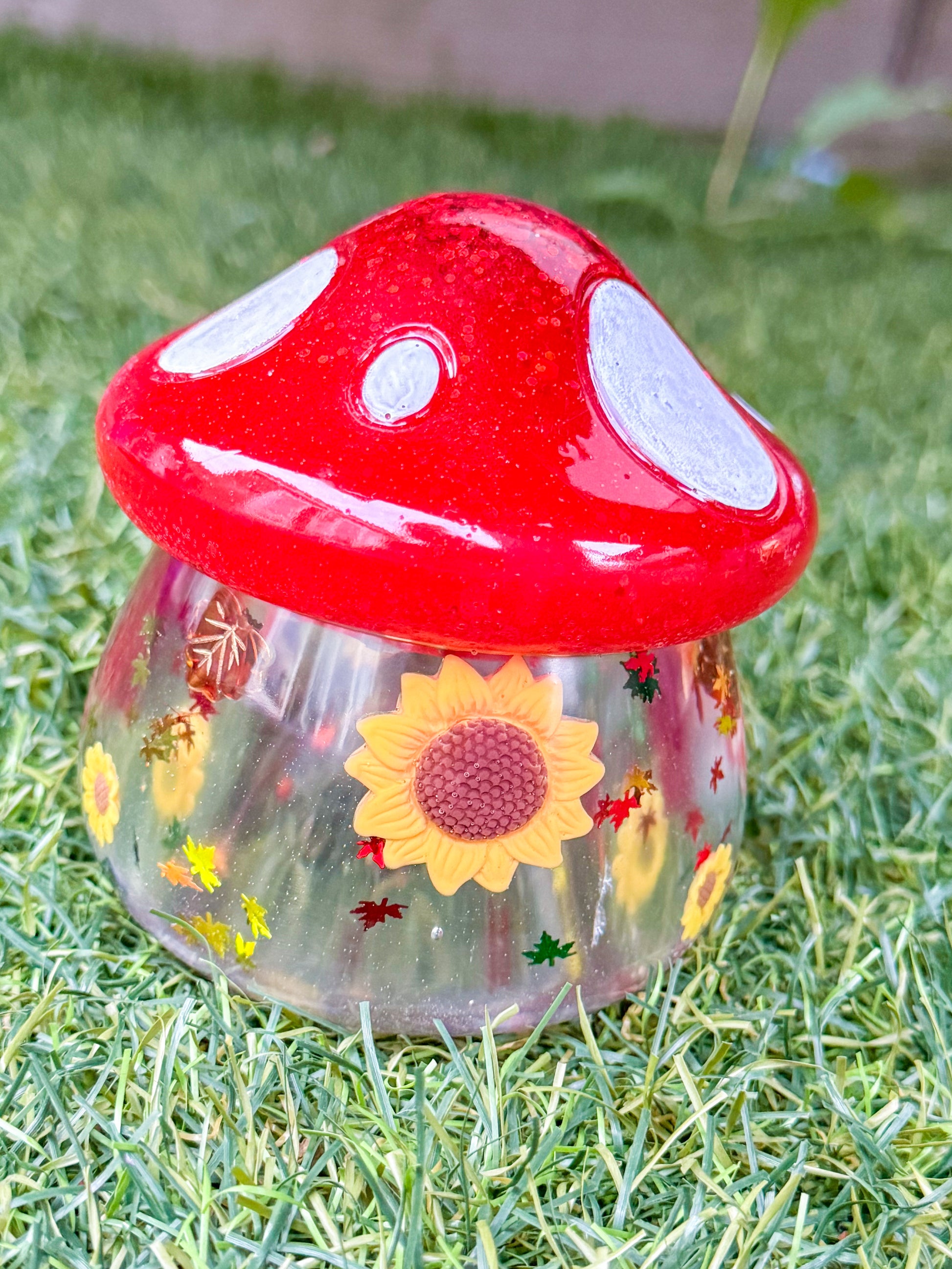 This magical toadstool jar is perfect for storing tiny treasures – from keepsakes to potions and slime. The clear base is filled with sunflowers and autumn treasures.