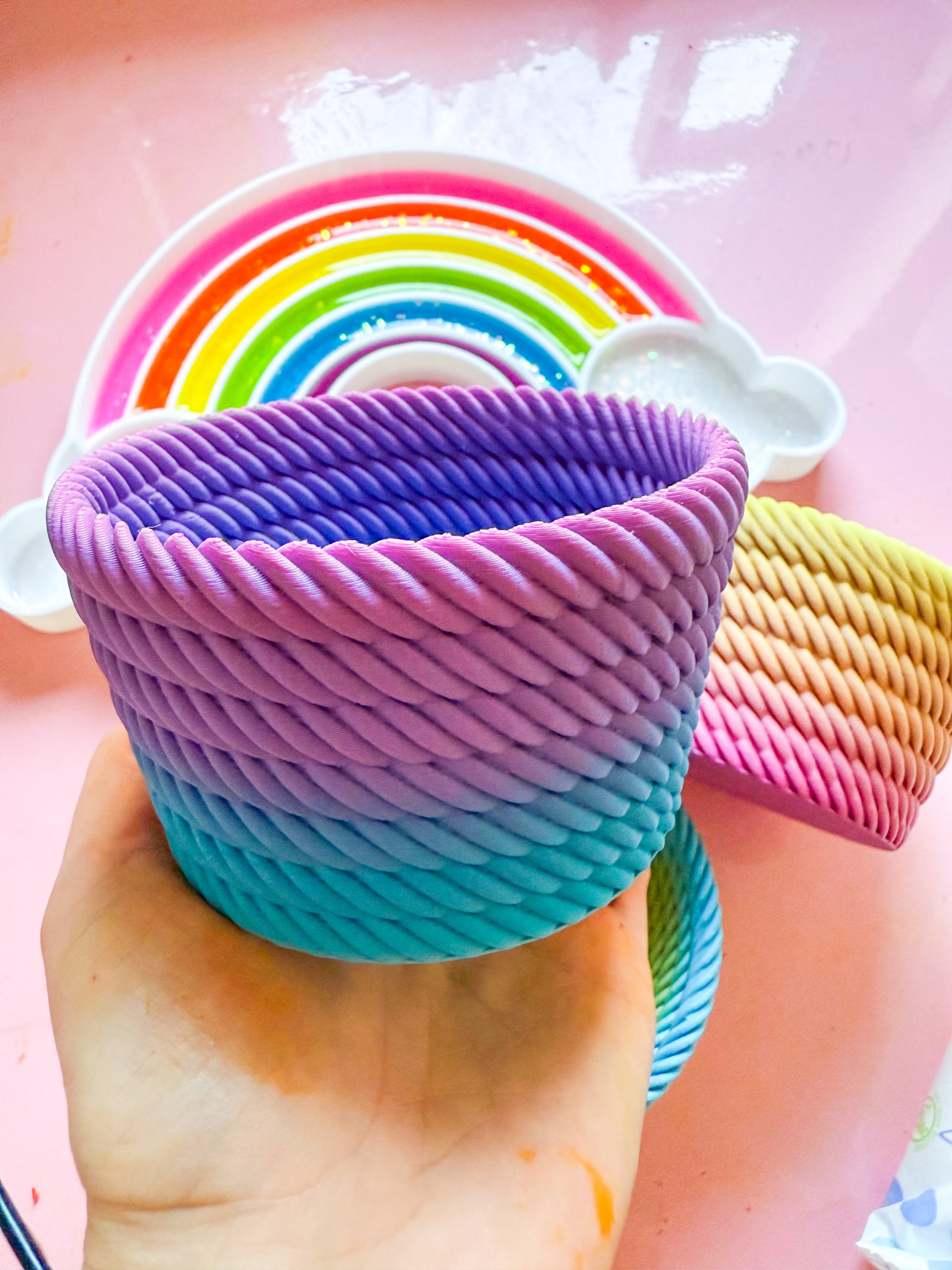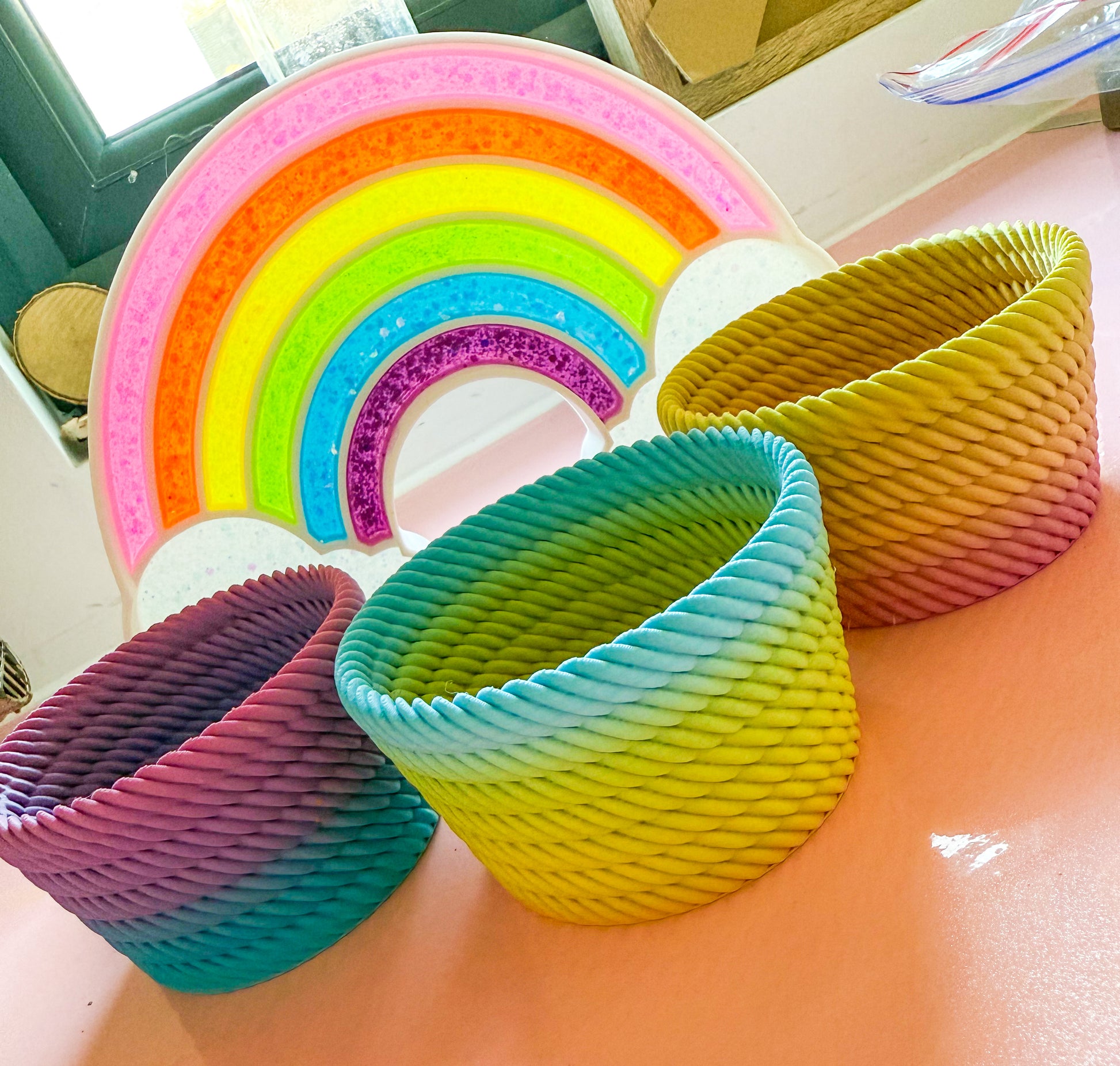 These chunky little bowls are 3D printed with a smooth rope-style finish and a soft gradient fade.