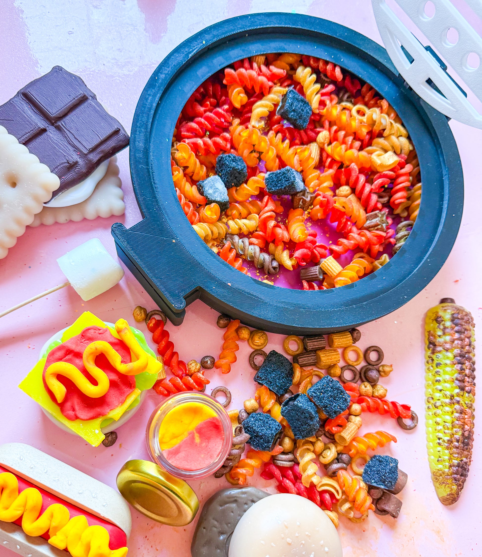 A 3D printed bbq grill with a hinge to lift up and down, add and remove your coals, use your tongs, squirt your mustard and ketchup playdough, a sensory mix that looks like glowing embers, corn on the cob with hand painted detailing, a hotdog, burger with lettuce and cheese, plus s’mores with a marshmallow treat.