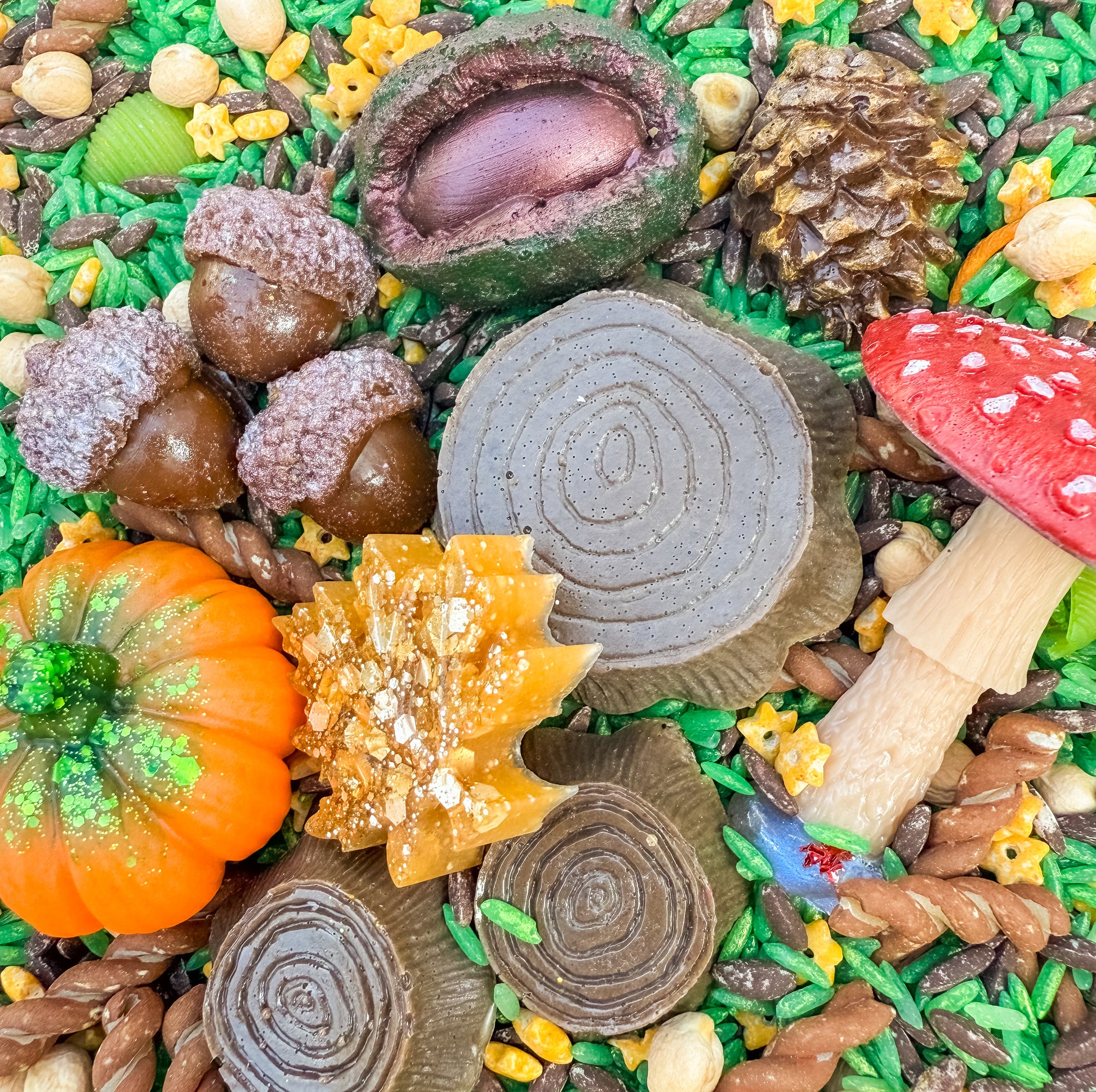 A set of 10 woodland treasures – acorns, pinecones, logs, toadstools and more. Each piece is hand-poured in resin with shimmery autumn finishes.