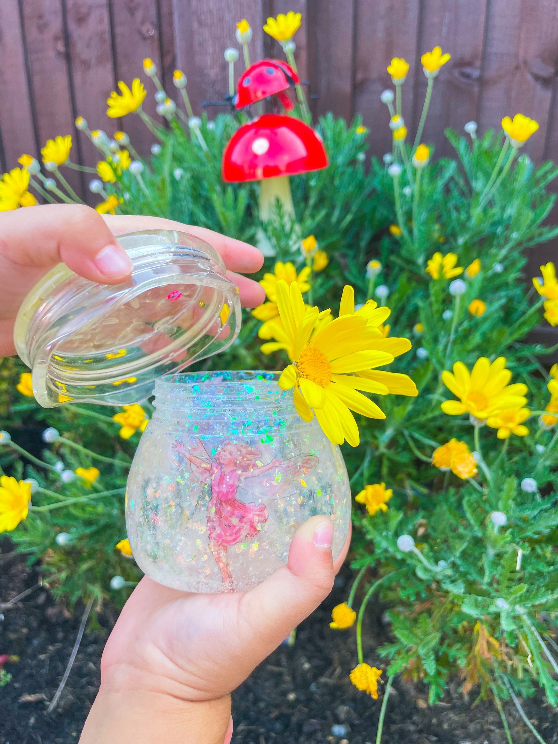 Fairy glitter themed resin jar suitable for messy play