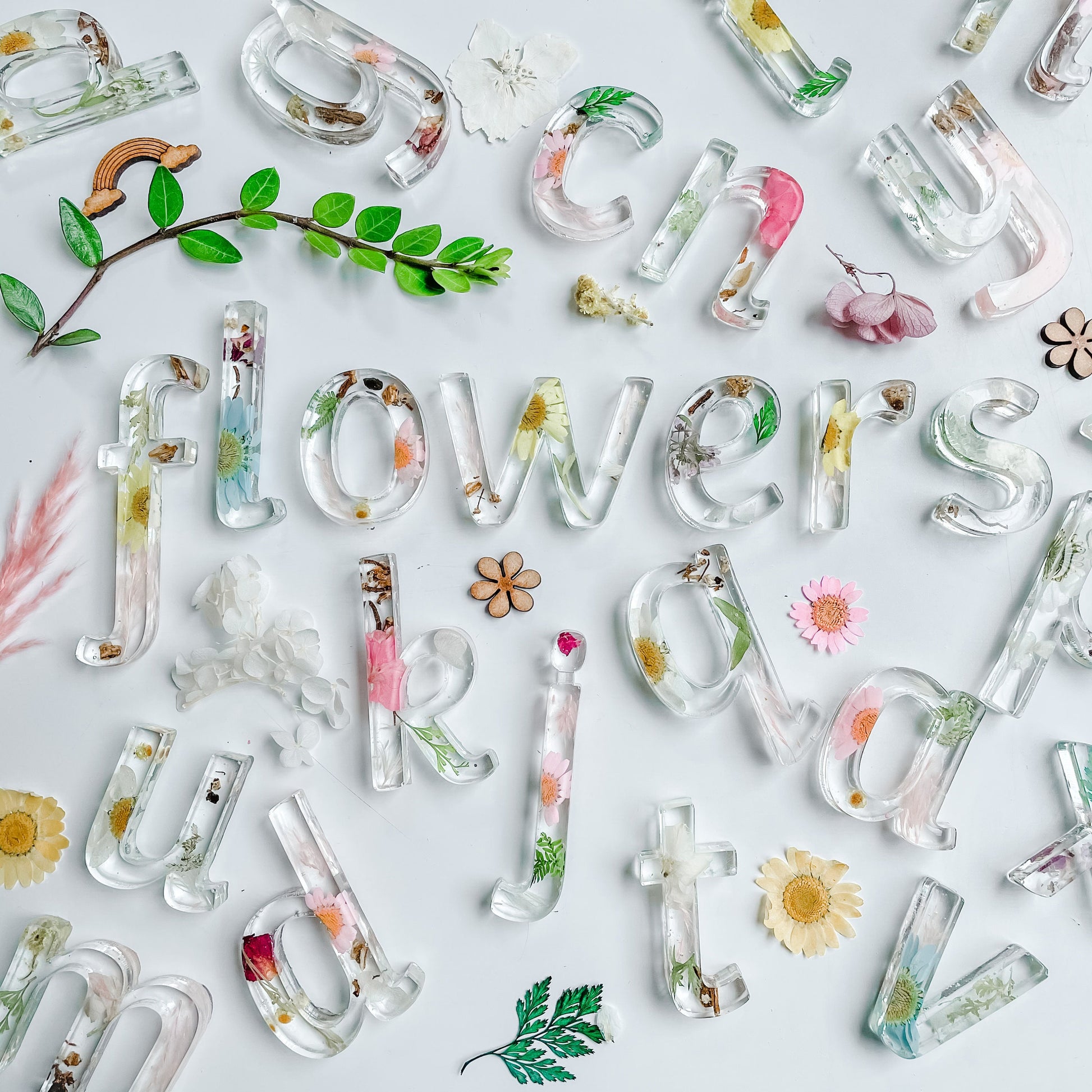 Resin letters with flowers and natural materials inside. Made with a font suitable for children learning to read and write with the correct letter formation.