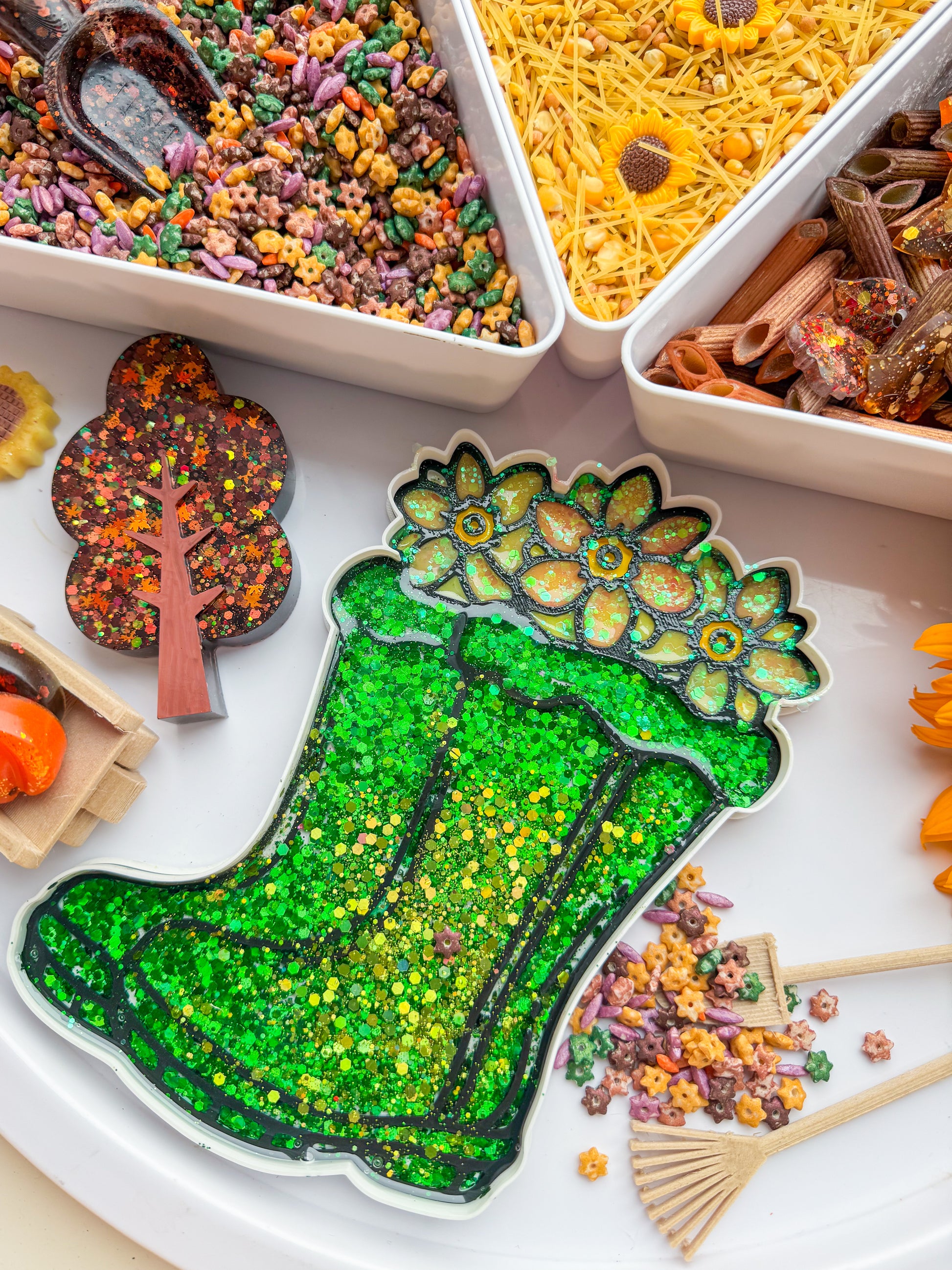 Sparkly green gardening boots, ready for play! Fill, scoop, and sort to build your own little garden scenes. Perfect for sensory play and open-ended fun.