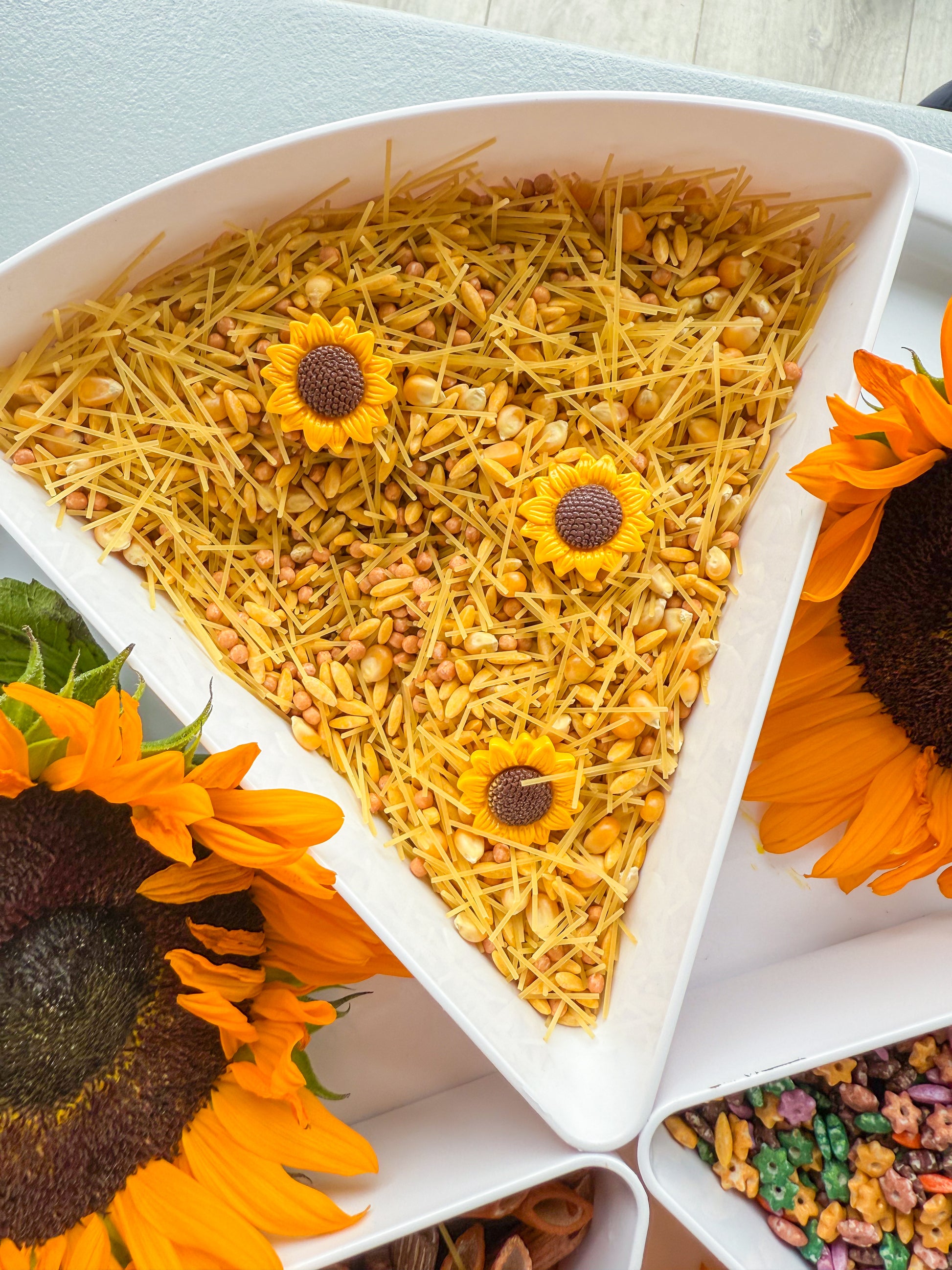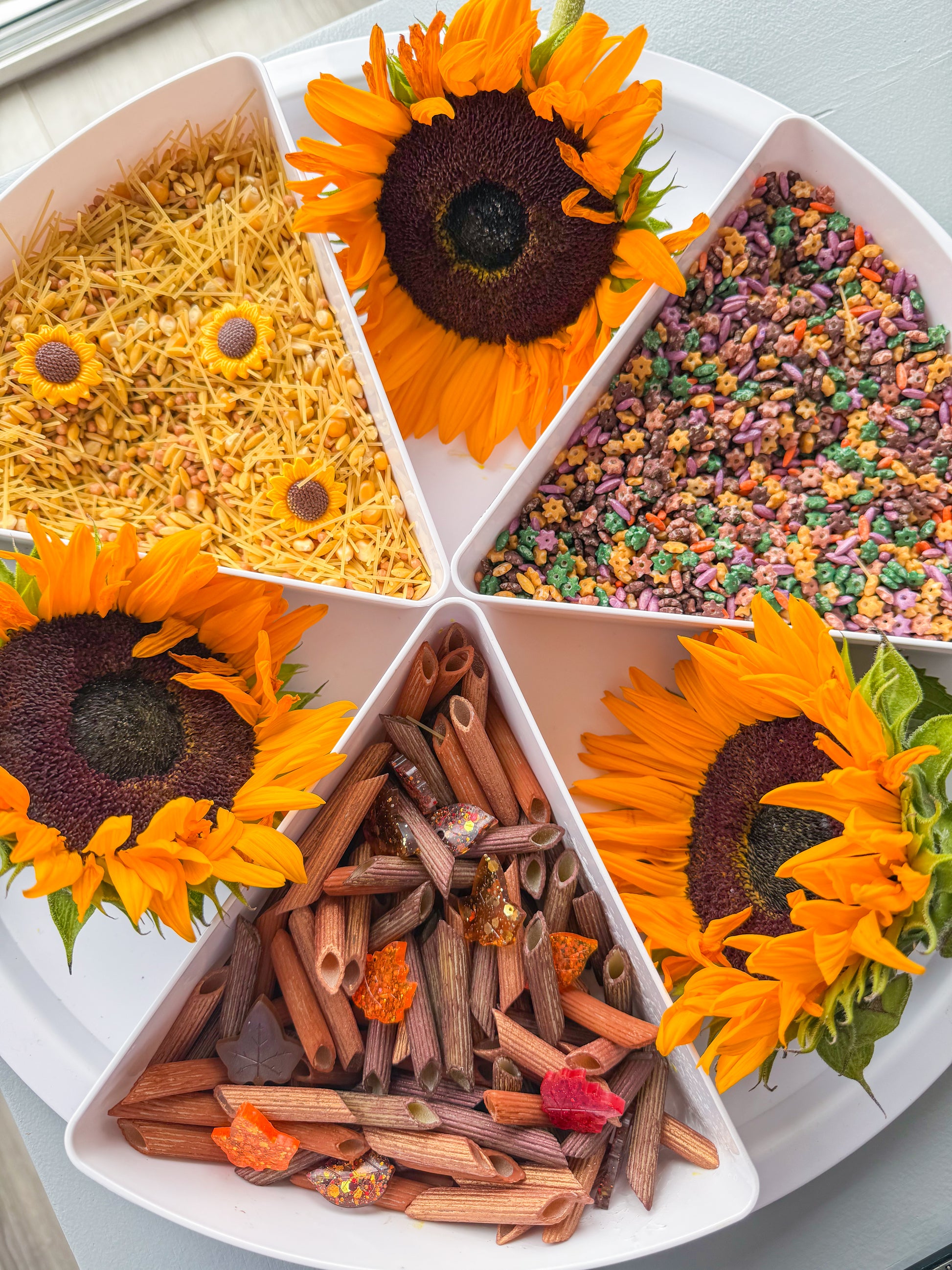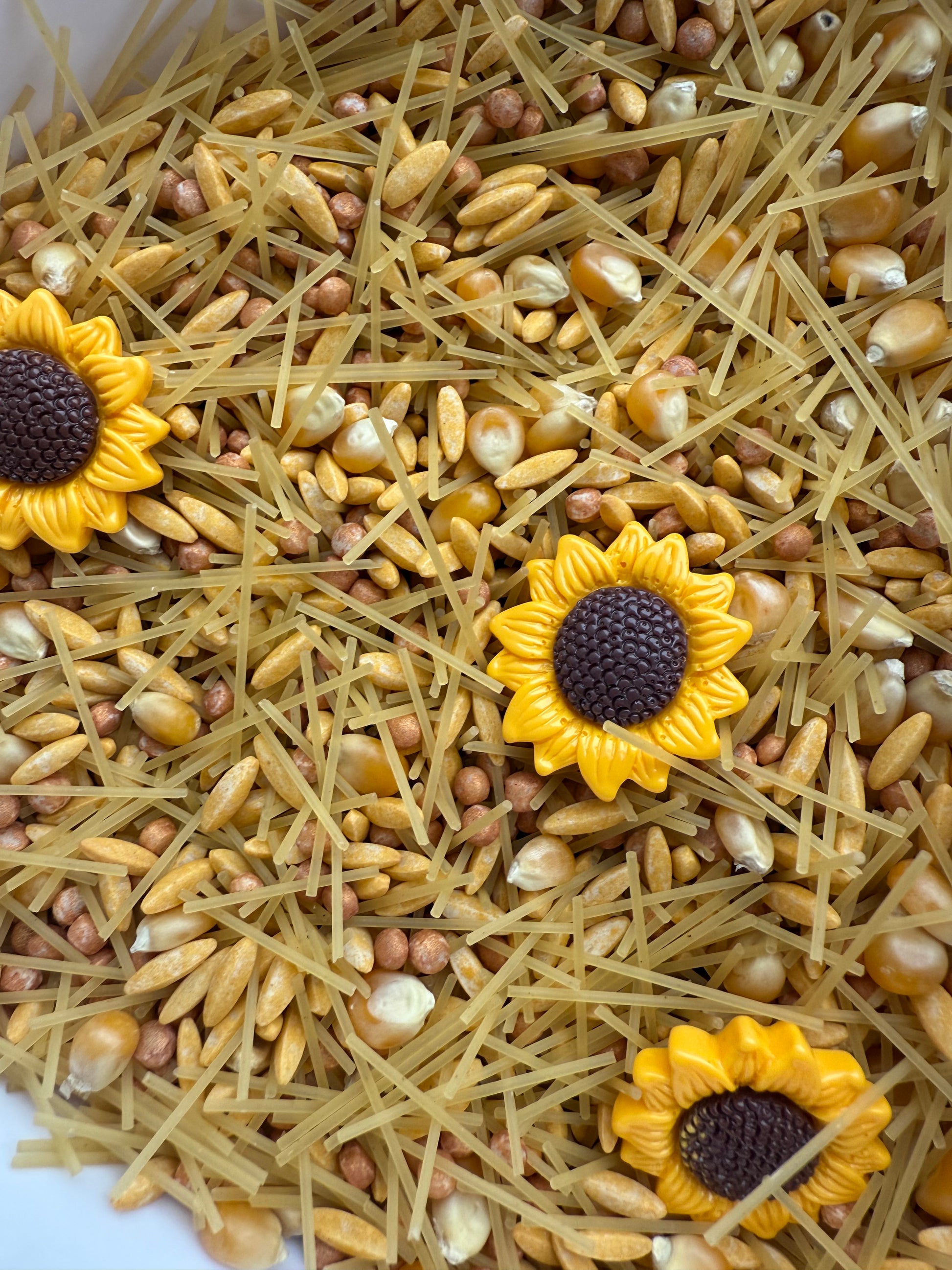 Golden pasta and resin sunflowers — a farmyard-inspired base for harvest and barnyard play.