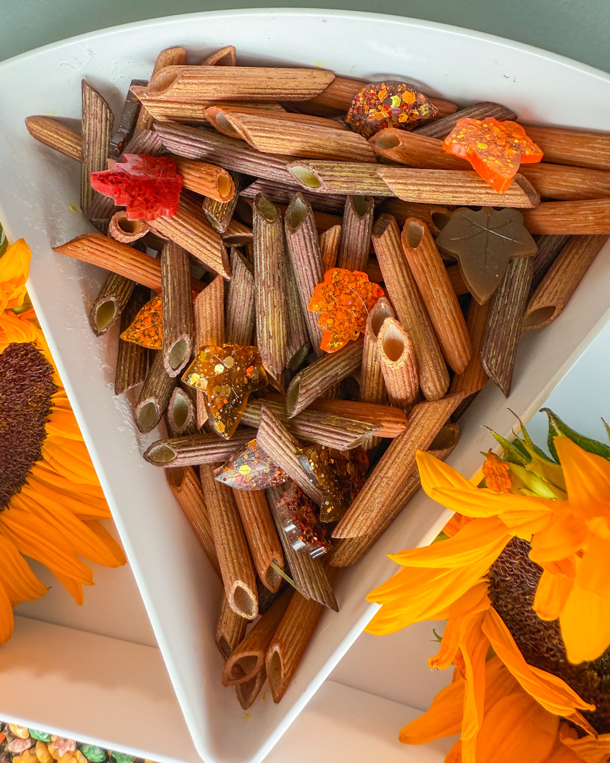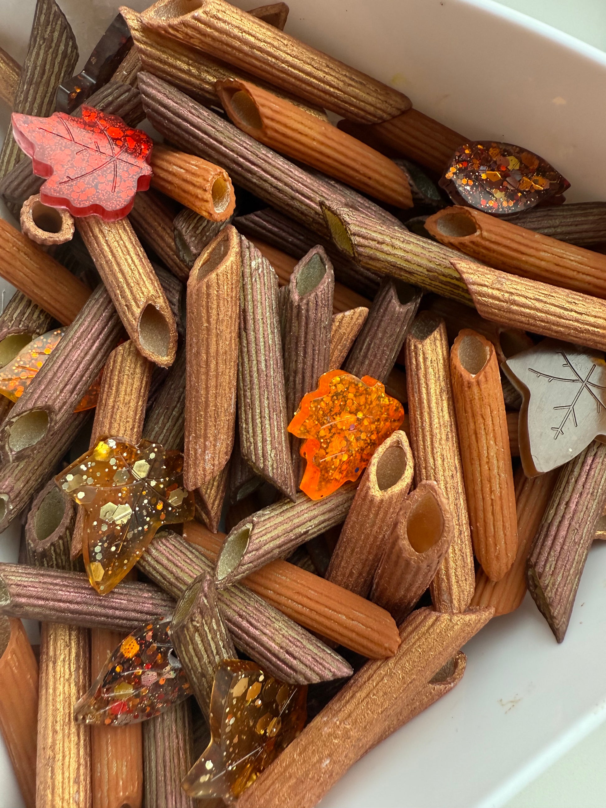 Brown pasta sticks with glittery resin leaves, perfect for creating woodland paths and twiggy textures.