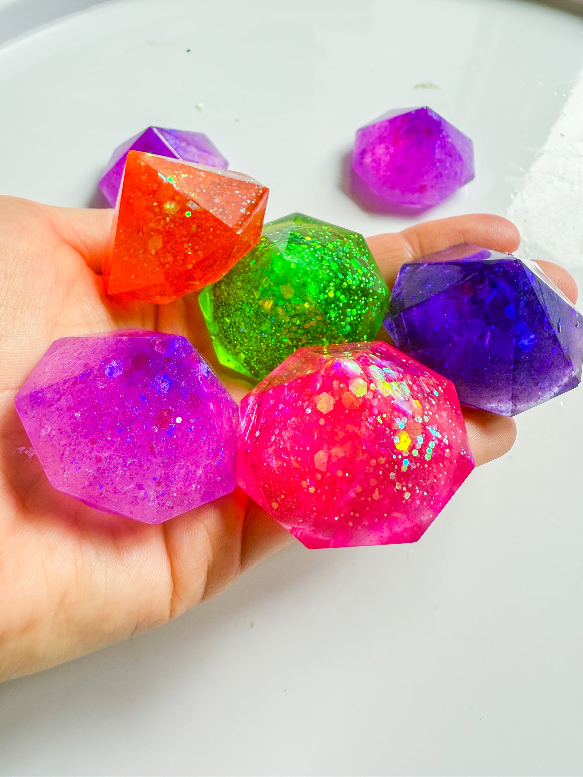 A set of chunky resin gems, full of sparkle and colour. Perfect for treasure hunts, potion play and adding a magical touch to your trays. Sold individually sets of 5.