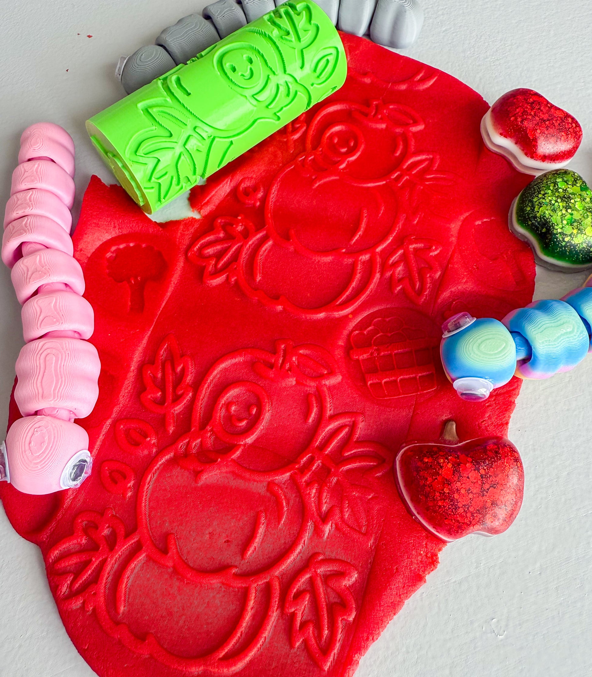 Roll out a cheeky apple scene with this play dough roller, complete with stamp designs on each end. Perfect for little hands to press, roll and create their own playful patterns. A fun addition to autumn trays.