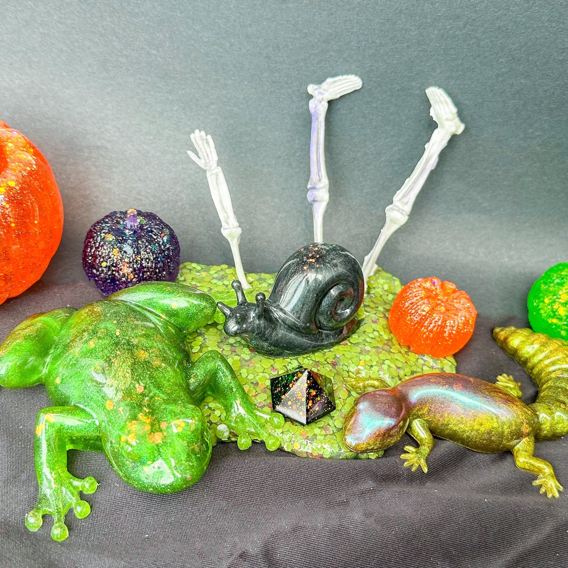 Large frog, snail, newt, skeleton, slime (will be slightly different to what’s in picture), mini pumpkin and sparkly jewel set.