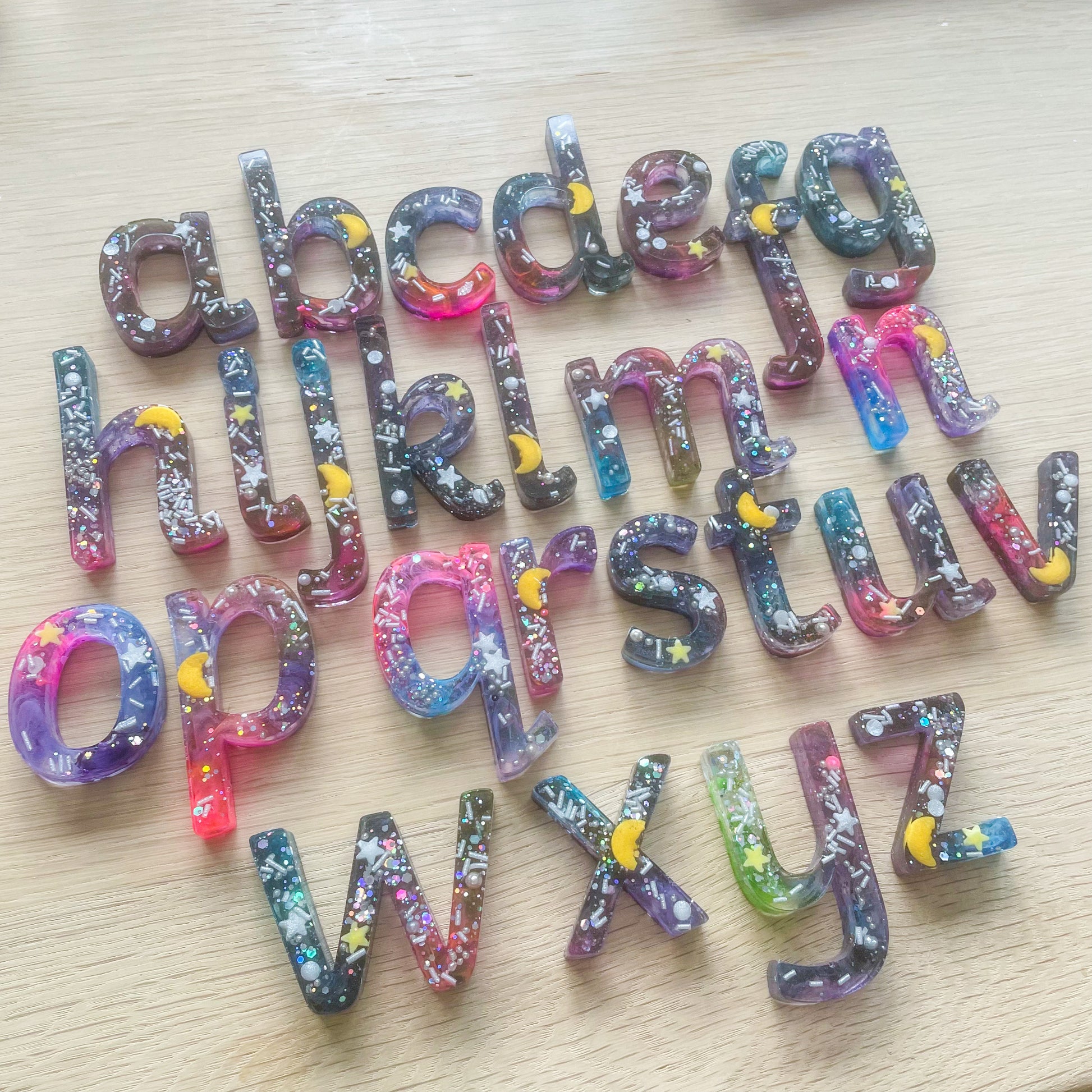 Resin alphabet in handwriting font suitable for children learning to read and write using the correct letter formation.
